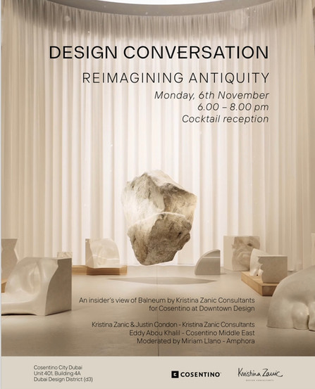 Kristina Zanic and Justin Condon from Kristina Zanic Consultants, along with Eddy Abou Khalil from Cosentino Middle East, orchestrated an enlightening talk that delved into the heart of the Balneum instalation. Their discussion, moderated by Miriam Llano of Amphora, was not just informative but also a celebration of innovative design meeting historical inspiration.