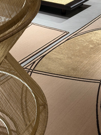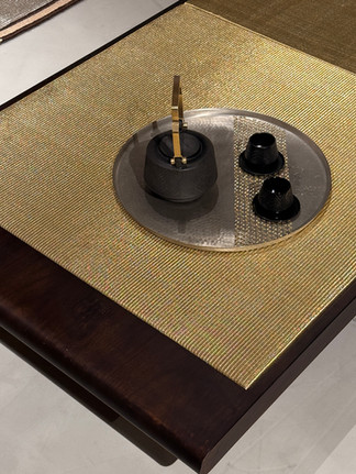 A dedicated room features a floor entirely covered in a bespoke tatami, handcrafted by a Japanese tatami master and sheathed in a woven metal surface in gold and silver tones. The space is complemented by Tatami Tea Tables and Daybeds in light walnut wood and bronze, adding warmth and harmony to the composition. On the walls, a large-scale tapestry pays homage to Monet’s Water Lilies, rendered in fine metallic threads that capture the fluidity of reflection and depth.